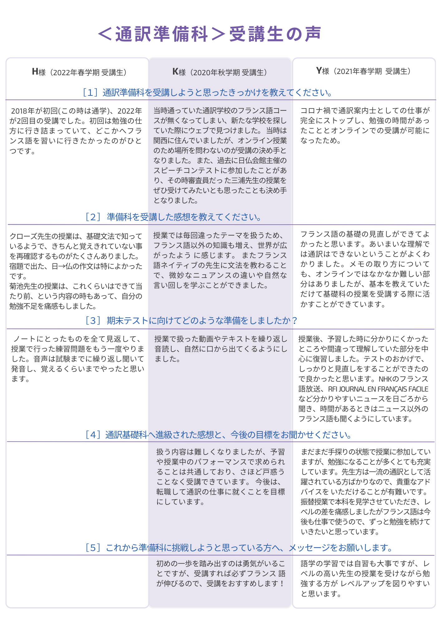 受講生の声 過去の通訳準備科受講生から寄せられた、受講のきっかけや期末テスト対策、基礎科へ進級した感想など、さまざまな体験談を掲載しています。詳しくはこちらをクリック |