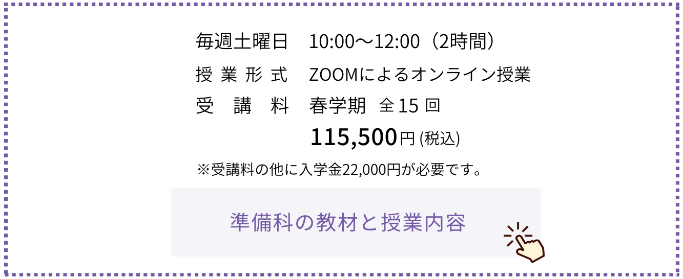 ■ 授業はすべてオンラインZOOMを使用したオンライン授業です。授業日の1週間前に、担当講師より教材を配信しますので、各自準備をしてください。動画や翻訳など、講師により毎回様々なタイプの教材に取り組みます。詳しい授業案内はこちらをクリック |