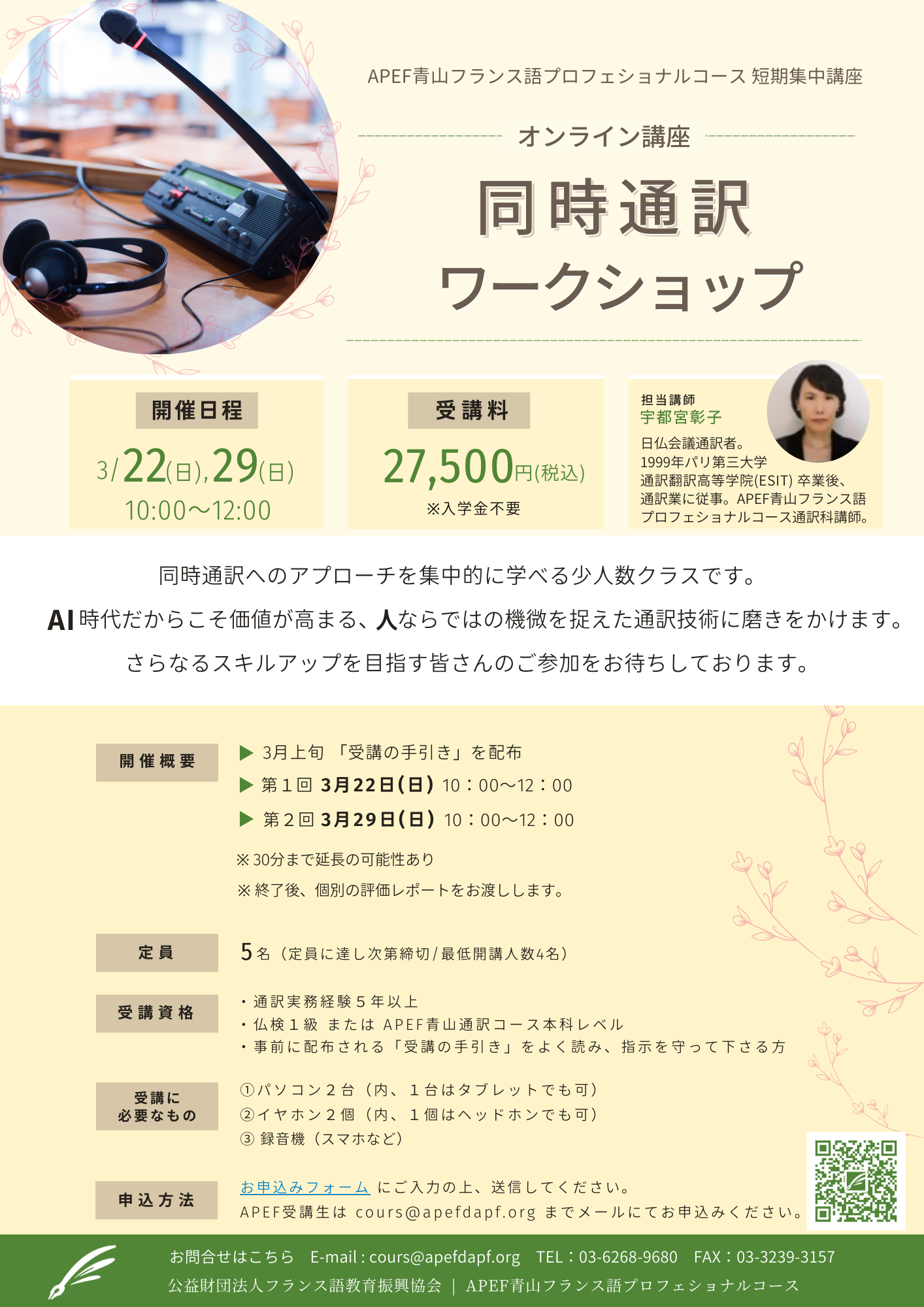 ・応募資格:仏検1級以上/通訳実務経験5年以上 ・定 員:5名 ・受 講 料:27,500円(税込)※入学金不要 【開講日程】2026年3月22日(日), 29日(日)※全2回 【開講時間】10:00~12:00(2時間) 【授業形式】オンライン(ZOOM) 【申込方法】お申込みフォームにご入力の上送信してください。 APEF受講生は cours@apefdapf.org までメールにてお申込みください。 |
